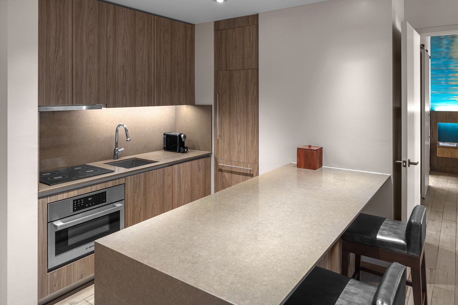 Our Junior Residence Suite welcomes you home with dedicated areas for lounging, cooking and dining, as well as a master bedroom with king-size bed, walk-in closet and spacious en suite with walk-in shower.